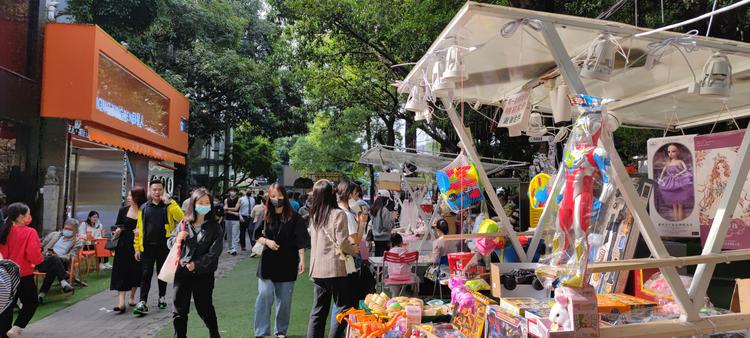 喝奶茶、吃烤串、擼寵物、玩游戲......5月2日下午15時許,天氣晴好,佛山創(chuàng)意產(chǎn)業(yè)園熱鬧非凡,到處是逛街消遣的市民,園區(qū)內(nèi)一個個新潮又接地氣的市集擺放著各種趣味好物,吸引人們駐足體驗。