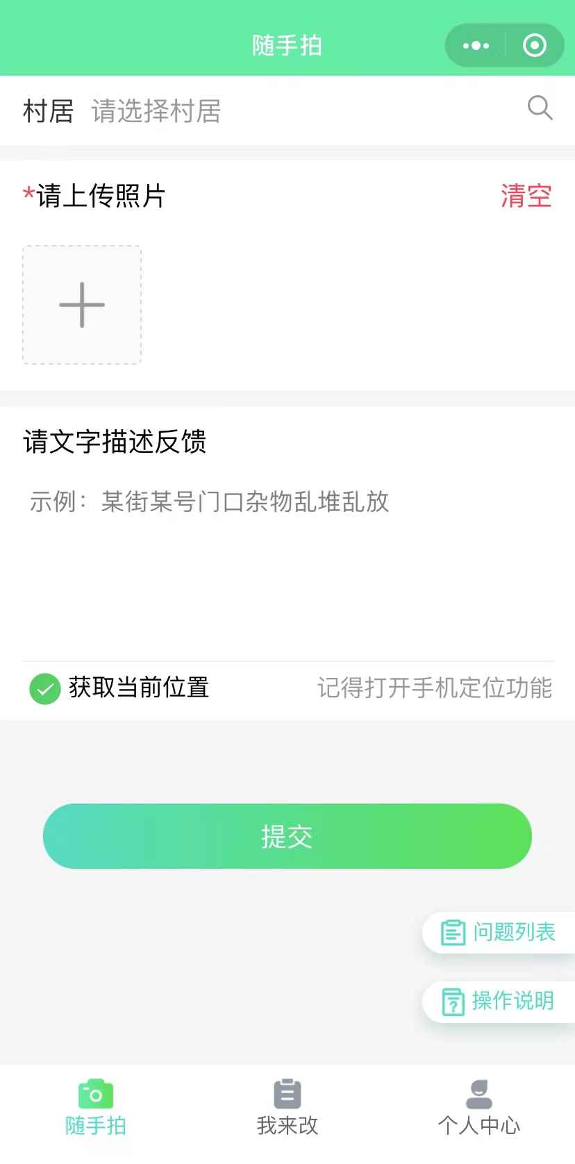 2、進入“隨手拍”界面,在搜索框選擇村居,上傳問題近遠照片、文字描述問題內容,提交。
