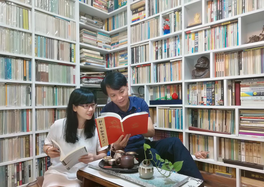 伍光玉(右)與妻子在家庭圖書館閱讀交流。