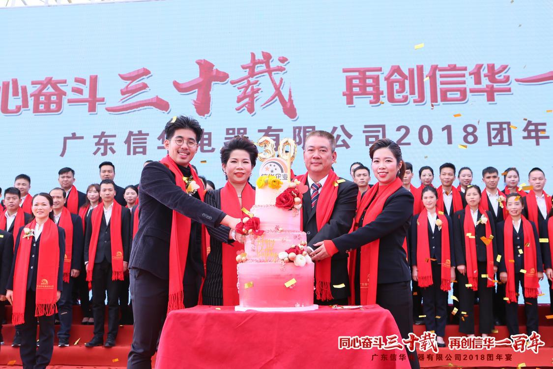 勞艷貞(前左二)與丈夫盧志信創(chuàng)辦的廣東信華電器有限公司三十周年慶典上(2018年),一家四口同臺(tái)合照。