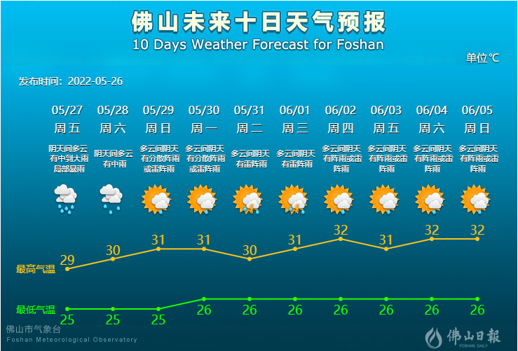 佛山市氣象臺5月26日預報,5月27日陰天間多云,有中到大雨、局部暴雨,氣溫25℃~29℃。28日(周六)陰天間多云,有中雨,氣溫25℃~30℃。29日(周日)~30日多云間陰天,有陣雨或雷陣雨,氣溫26℃~31℃。31日多云間陰天,有雷陣雨,氣溫26℃~30℃。展望6月1日~2日多云間陰天,有陣雨或雷陣雨,氣溫介乎26℃~32℃,天氣趨悶熱。