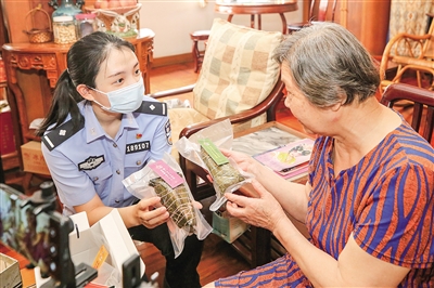 民警為轄區(qū)老人送上“平安粽子”。