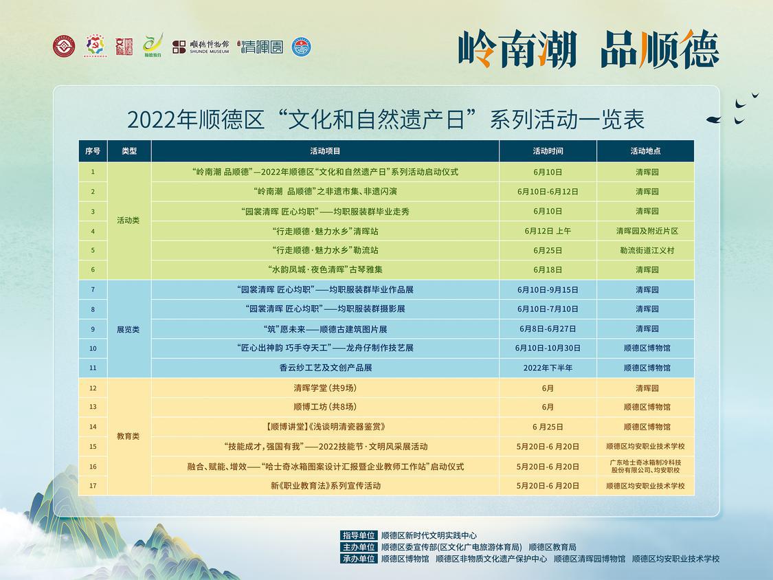 在文化和自然遺產(chǎn)日來臨之際,6月10日,“嶺南潮 品順德”——2022順德區(qū)“文化和自然遺產(chǎn)日”系列活動(dòng)在清暉園博物館拉開序幕?;顒?dòng)發(fā)布了非遺搶救性紀(jì)錄片、清暉園文物保育宣傳片以及非遺匯編書籍,啟動(dòng)了2022“非遺進(jìn)校園”活動(dòng)。此外,在現(xiàn)場,市民游客還可以進(jìn)行非遺市集體驗(yàn)、品味精品展覽等。
