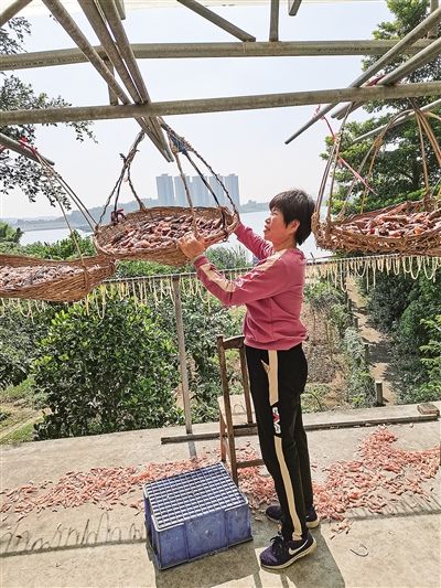 每年秋冬,富興隆漁村餐廳后的菜地就成為臘鴨扎食材的晾曬場(chǎng)。圖為李桂英在晾曬臘鴨扎。/受訪者供圖