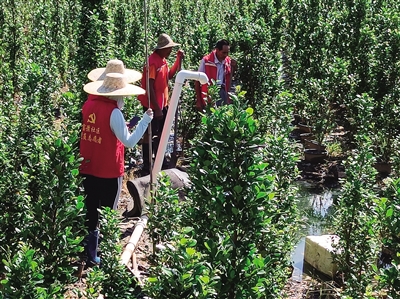 近日,三水區(qū)白坭鎮(zhèn)黨員干部參加對堤圍內(nèi)部的檢查,防止發(fā)生滲水險情。/通訊員丁健迪供圖