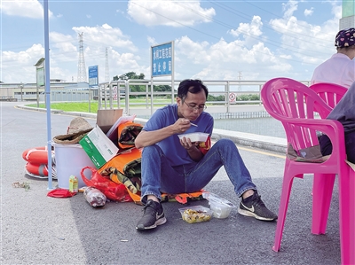 6月23日中午12時許,北江大堤上的氣溫已達到35℃,巡堤的工作人員在堤圍上吃盒飯。/佛山日報記者周傳勇攝