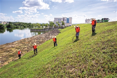 6月23日,天氣炎熱,高明區(qū)荷城街道水利所水利工程師們在滄江河河堤上巡堤。/佛山日報記者洪海攝