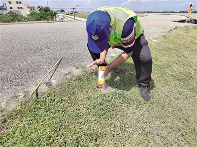 6月23日是佛山市今年首個高溫日。“今天天氣好,陽光猛烈,沒有下雨。要是天氣惡劣,我們還得仔細分辨草皮下面的積水到底是雨水,還是管涌滲漏水。難度會更大?!敝x勇芬說,他們巡堤時,一旦發(fā)現(xiàn)有滲漏,就要用鏟子剝開草皮,把水引出去。有時還得在滲漏位置插上小紅旗,做個標記,以提醒搶險的同事和后續(xù)值守干部留意這里情況。