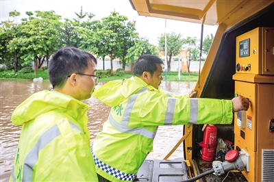 7月3日,在高明區(qū)三和路路段,工作人員操作泵機(jī)排水。/佛山日報(bào)記者洪海攝