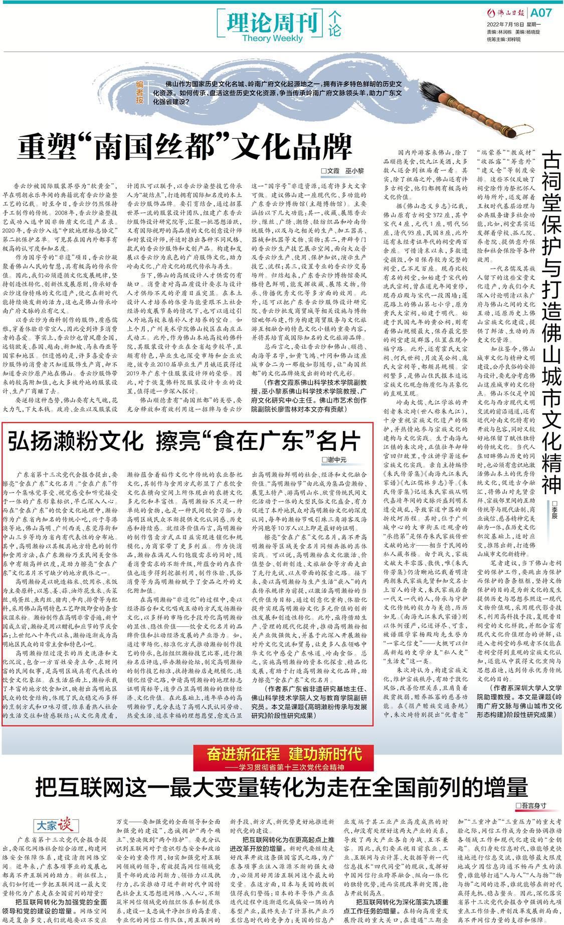 擦亮“食在廣東”文化名片,離不開高明瀨粉等區(qū)域美食名片同頻共振的具體實(shí)踐??梢哉f,高明瀨粉在文化激活、價(jià)值整合、創(chuàng)新創(chuàng)造、文旅融合等方面走出了先行先試、以點(diǎn)帶面的探索之路。接下來,要以高明瀨粉與生產(chǎn)生活“嵌入”的內(nèi)在傳承規(guī)律為前提,以激活高明瀨粉的當(dāng)代價(jià)值為目標(biāo),通過創(chuàng)意化重構(gòu)、體驗(yàn)化提升實(shí)現(xiàn)高明瀨粉文化多元價(jià)值的創(chuàng)新性發(fā)展和創(chuàng)造性轉(zhuǎn)化。此外,亟待借助生產(chǎn)、管理的現(xiàn)代化提升,推動高明瀨粉相關(guān)產(chǎn)業(yè)做強(qiáng)做大,并基于此深入開展瀨粉對外文化交流和貿(mào)易,讓更多人在領(lǐng)略中華文化中感受廣東味道、嶺南食俗??傊瑢?shí)施高明瀨粉的資本化探索、精品化發(fā)展,有助于打造高明瀨粉文化品牌,助力擦亮“食在廣東”文化名片。