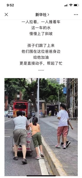 7月17日下午,新華社微信公眾號(hào)推送《路遇一位吃力的“山城棒棒”,父女來(lái)了一場(chǎng)感人的現(xiàn)場(chǎng)教學(xué)!》,短時(shí)間內(nèi)閱讀量10萬(wàn)+,點(diǎn)贊超8000。
