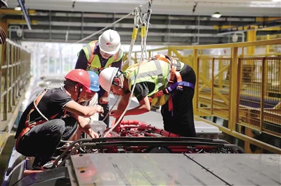 高溫天氣下,佛山地鐵3號(hào)線工作人員正在開展檢修工作。