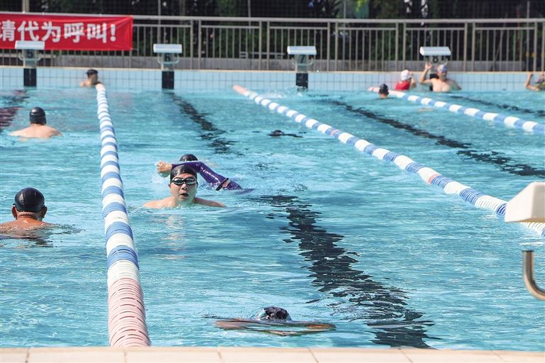世紀(jì)蓮體育中心游泳館內(nèi),市民在泳池中享受清涼。/佛山日報(bào)記者盧麗華攝