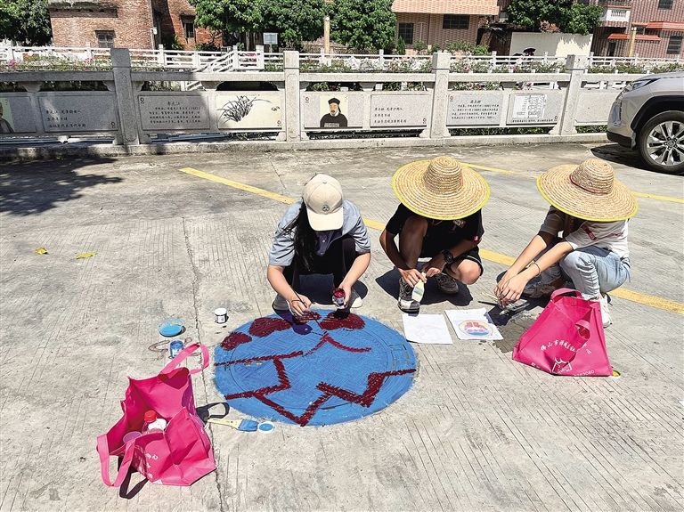 參與活動的村民在老師、志愿者的帶領(lǐng)下,在沙井蓋上進(jìn)行手繪。 /通訊員供圖