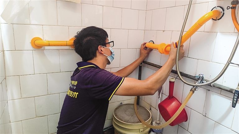了解基本情況后,工作人員開(kāi)始改造工作。微改造有5項(xiàng)內(nèi)容,包括地面防滑處理、安裝扶手、緊急呼叫器、小夜燈和浴椅。