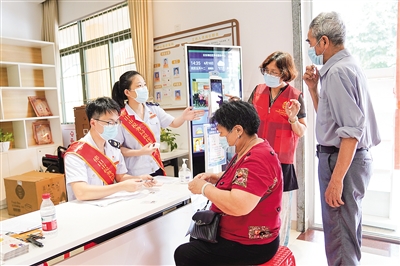 鄧建玲(右二)與佛山市稅務(wù)局稅傳薪火青耆志愿服務(wù)隊(duì)三水分隊(duì)成員在云東海社區(qū)養(yǎng)老服務(wù)中心開展老人疫苗接種志愿服務(wù)。 /三水區(qū)稅務(wù)局供圖