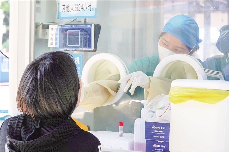 把手穿進(jìn)塑膠手套、用酒精洗手、拿起棉簽收集樣本……看似簡單、重復(fù)的幾個(gè)動(dòng)作,一做就是一天。人多時(shí),醫(yī)護(hù)人員甚至連水都顧不上喝。同樣在該檢測點(diǎn)進(jìn)行核酸采樣的醫(yī)護(hù)人員曾美蘭說,檢測點(diǎn)每天共有4名醫(yī)護(hù)人員值守,一天平均工作時(shí)間達(dá)七八個(gè)小時(shí)。