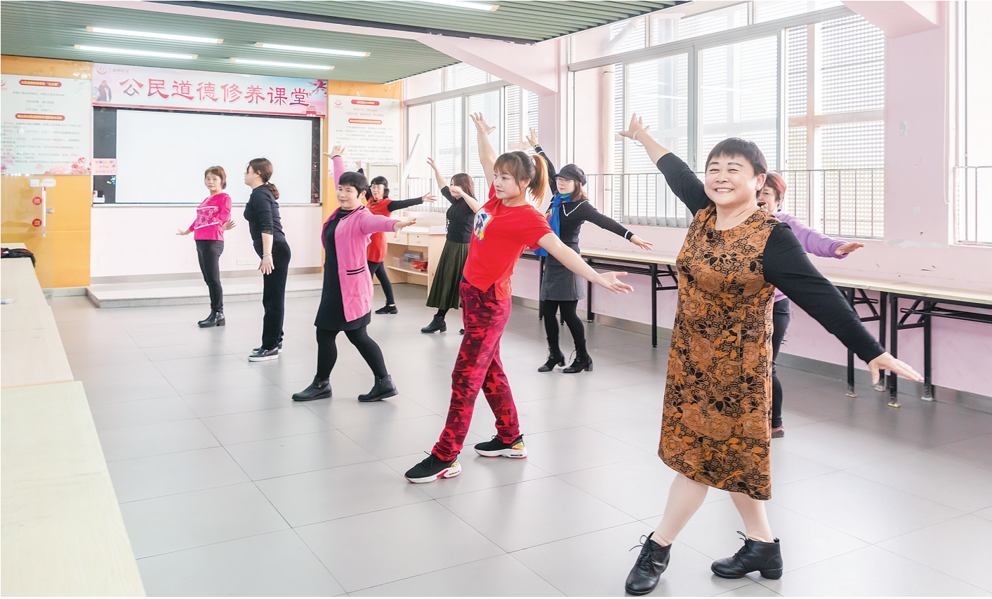 2022年2月28日,在三水區(qū)文鋒西社區(qū)新時代文明實踐站,居民正在跳舞。 /佛山日報記者王澍攝