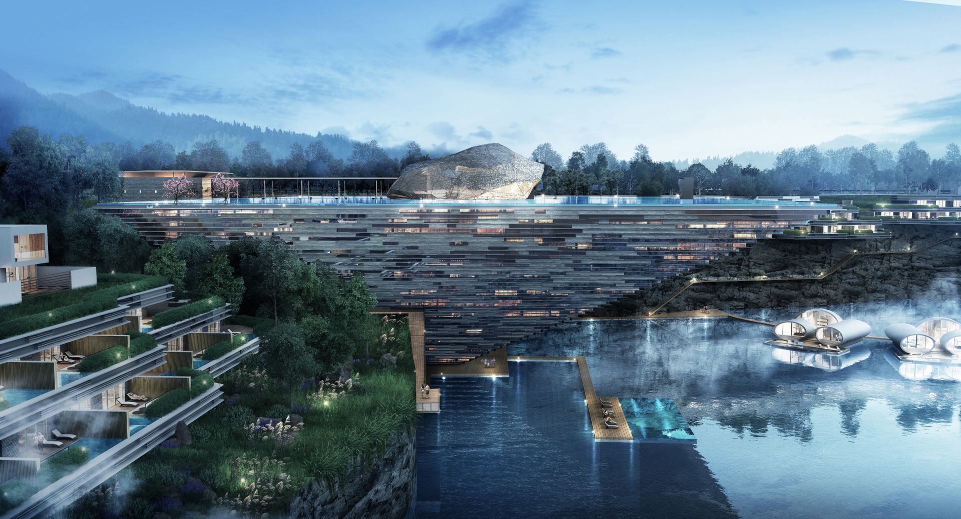 酒店集群計(jì)劃投資5億元,預(yù)計(jì)3-5年建成,建成后將成為粵港澳大灣區(qū)內(nèi)又一新地標(biāo)。其中,位于小礦坑內(nèi)的是奢華品牌“悅椿”,它的主體設(shè)計(jì)如一塊天外飛來的巨石??吭诘V坑邊,崖壁客房設(shè)計(jì)也是別具特色。而利用廢舊磚廠改造的時尚潮牌“悅苑”將成為保留工業(yè)遺存文化的網(wǎng)紅打卡點(diǎn)。