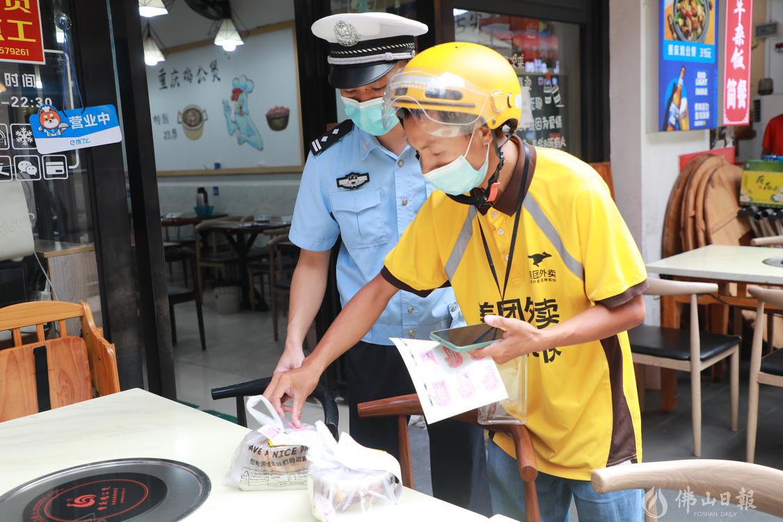 外賣小哥將文明交通宣傳貼紙貼在包裝袋上。