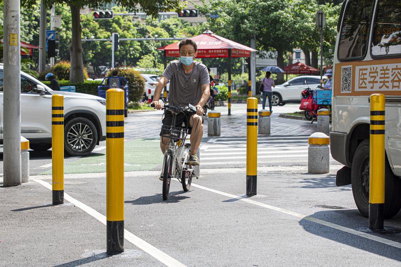 在停車位以外的公共空間增加了單車道標(biāo)線,劃分了單車和行人的通行空間。/佛山日?qǐng)?bào)記者符詩賀攝