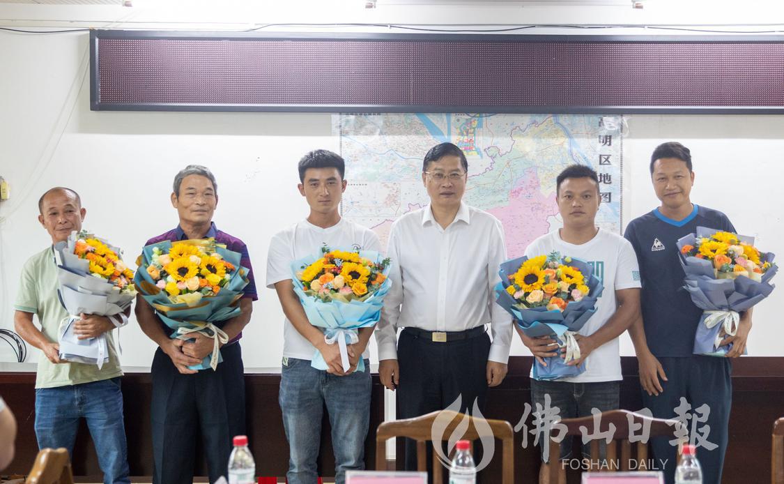 佛山市人大常委會副主任、高明區(qū)委書記楊永泰帶隊前往更合鎮(zhèn)白石村委會慰問見義勇為的“托舉哥”余森、侯強等五名熱心群眾。