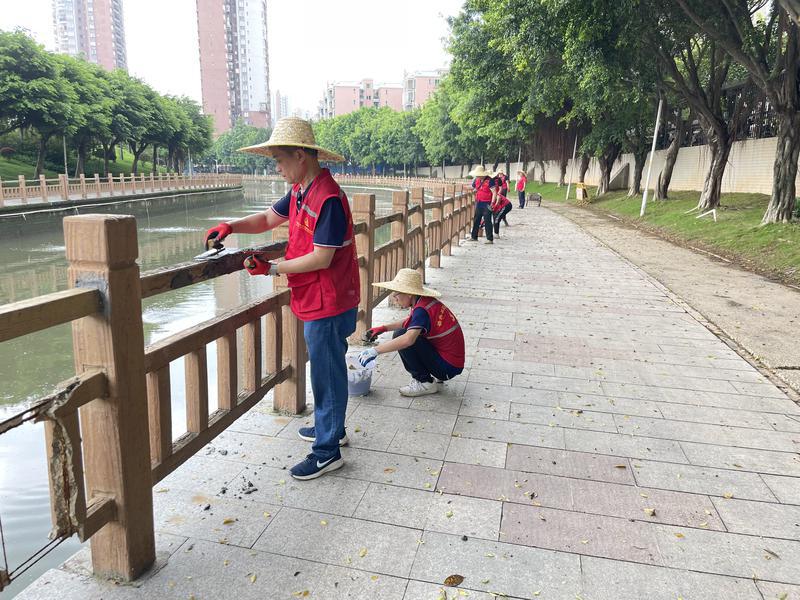 三水區(qū)西南街道橋頭社區(qū)黨群志愿者參與河堤護(hù)欄修復(fù)工作。/社區(qū)供圖