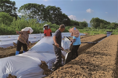 24日,在三水區(qū)大塘鎮(zhèn)勁農(nóng)生態(tài)園區(qū)種植基地,工人給新種作物覆膜防御臺風(fēng)。/受訪者供圖