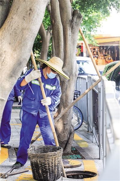 24日,禪城區(qū)引排水調(diào)度中心工作人員在榴苑路及周邊對窨井、下水道進(jìn)行清疏。 /佛山日報(bào)記者劉乙丁攝