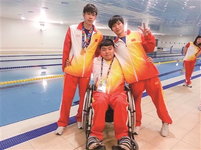 崔永佳(右一 )和隊(duì)友游泳比賽前留影。 /市殘聯(lián)供圖
