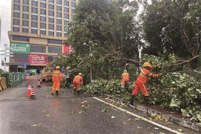 25日清晨,禪城區(qū)園林工人在季華路湖涌大道處理黃槿斷枝。/部門供圖
