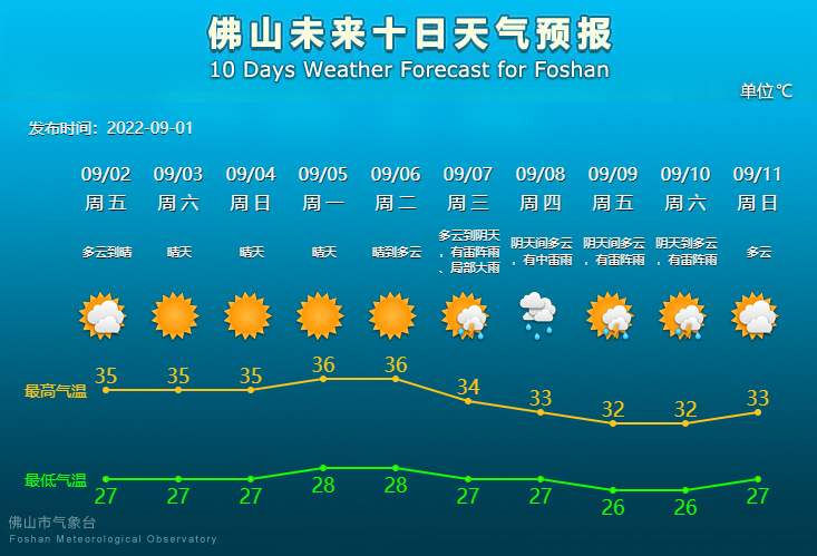 佛山市氣象臺9月1日預(yù)報,未來5天我市天氣持續(xù)晴熱高溫,其中9月2日~4日氣溫27℃~35℃,9月5日~6日氣溫28℃~36℃。展望9月7日起雨水再度上線,高溫天氣有望緩解。