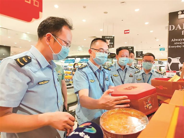 市監(jiān)執(zhí)法人員到銷售門店檢查是否存在“天價(jià)”月餅及過(guò)度包裝等問(wèn)題。