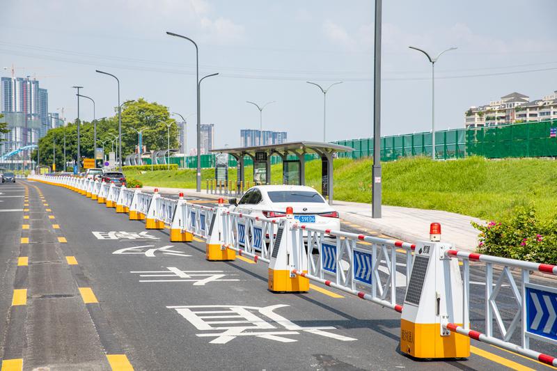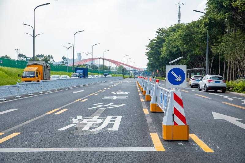 佛山市第三中學門前“潮汐機器人”正變換分隔車道位置。/佛山日報記者符詩賀攝
