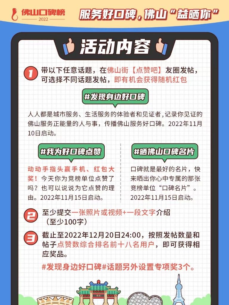 值得一提的是,主辦方還同步推出多個(gè)互動(dòng)新玩法。其中,“佛山+”APP全面上線了網(wǎng)絡(luò)口碑社區(qū)“點(diǎn)贊吧”,作為佛山口碑榜活動(dòng)的網(wǎng)上陣地。它將貫穿全年始終,定期設(shè)置熱議話題,打造口碑友圈,讓更多市民隨時(shí)隨地分享身邊關(guān)于公共服務(wù)和生活服務(wù)的正能量故事。同時(shí),活動(dòng)還將面向全網(wǎng)招募“城市口碑推薦官”,邀請(qǐng)一批具有影響力的網(wǎng)絡(luò)意見(jiàn)領(lǐng)袖,一起宣傳和推廣佛山城市服務(wù)優(yōu)質(zhì)口碑魅力。此外,主辦方再次組建佛山口碑觀察員隊(duì)伍,將人大代表、政協(xié)委員的履職從“兩會(huì)”延伸到平時(shí),為城市治理監(jiān)督、暢通社情民意提供新渠道。