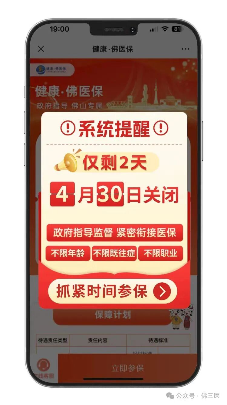 僅剩2天!“健康·佛醫(yī)保”集中參保工作即將截止 2024-04-29 11:28 “健康·佛醫(yī)保”是政府指導(dǎo)的惠民保險 具有保障低、待遇全、參保零門檻的特點 保費統(tǒng)一價僅需185元/人 即可享受全年最高330萬醫(yī)療保障! 覆蓋住院、門特、門診及特定病種自費藥 可對醫(yī)保結(jié)算后的剩余費用進行補充報銷 降低個人和家庭的經(jīng)濟壓力 實打?qū)崬榛颊呓鉀Q看病難題 保障計劃
